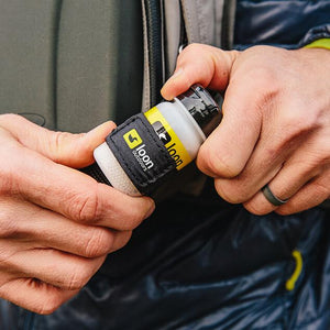 Remove bottle cap and slide bottle through hole in bottom of caddy. Replace cap on bottle. Secure bottle with elastic strap. Attach to vest, pack, etc.