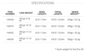 | 144568 | 350 gr 9-10 wt | 25.0’ / 7,6m | 105.0’ / 32,0m | 350gr / 22,7g |